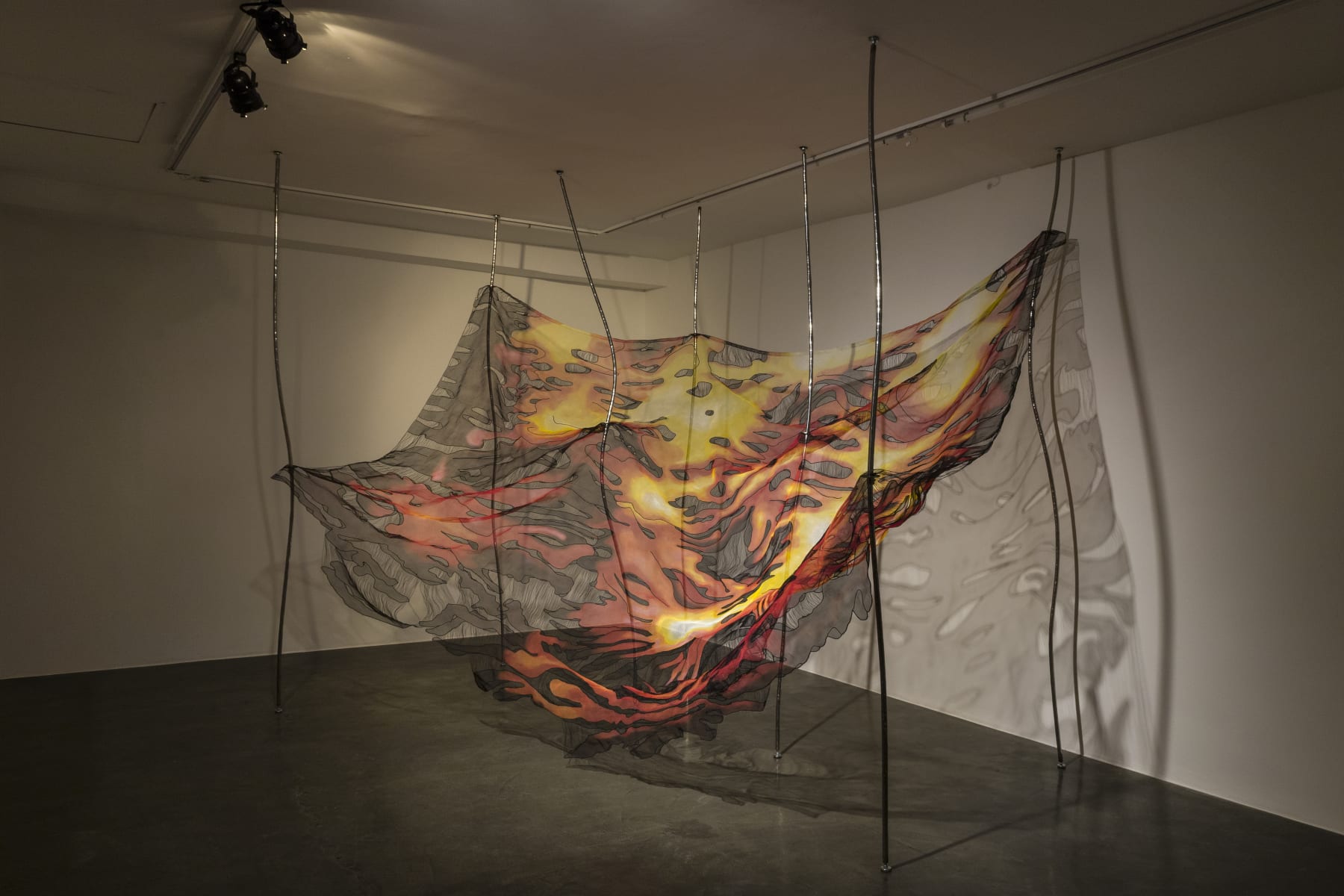 This recent body of work departs from the artist’s desire to move beyond the tendency to rationalize every gesture and to dismantle the false dichotomy between body and mind, or feeling and thinking. Through immersive soundscapes, animations, embroidered sonograms, drawings, and sculptures, Caccuri depicts the fleeting moment when heightened emotion dissolves consciousness—when the boundaries of the self melt into pure sensation and restore a long-lost inner rhythm of time. These private sounds are amplified and projected into the space paired with images of women dissolving into abstraction. NOCETRA permeates the boundary between the private and the public, inviting viewers to listen and feel together.