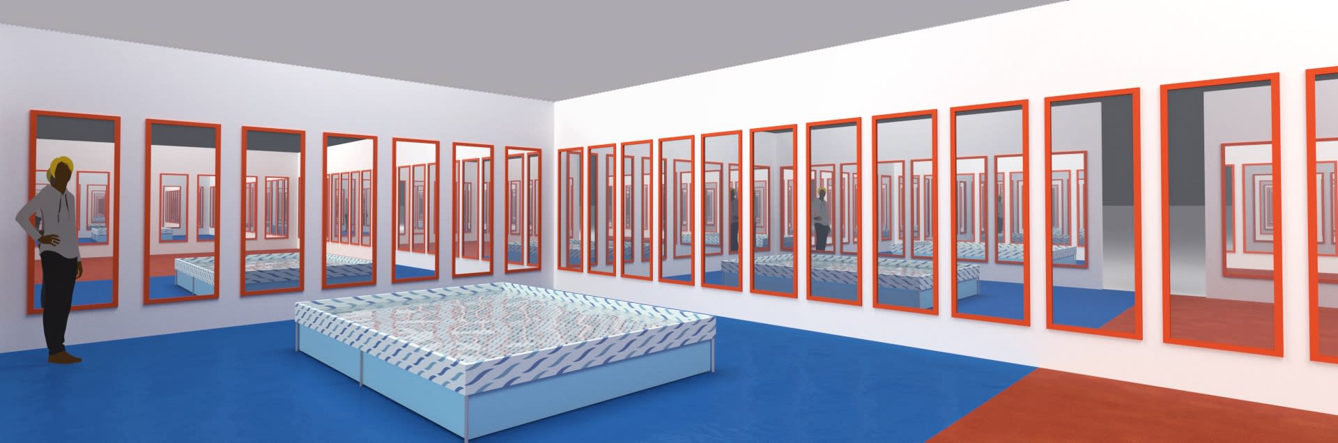 Maxwell Alexandre presents an installation of two symmetrical and contrasting environments – composed of several Romeo Mirrors and a Capri Pool –, where the audience, barefoot, is invited to enter the mythology that the artist has been building from symbols of the popular culture. A piece with a mythical aspect and with a essential condition in relation to what builds and dissolves the place where he comes from.