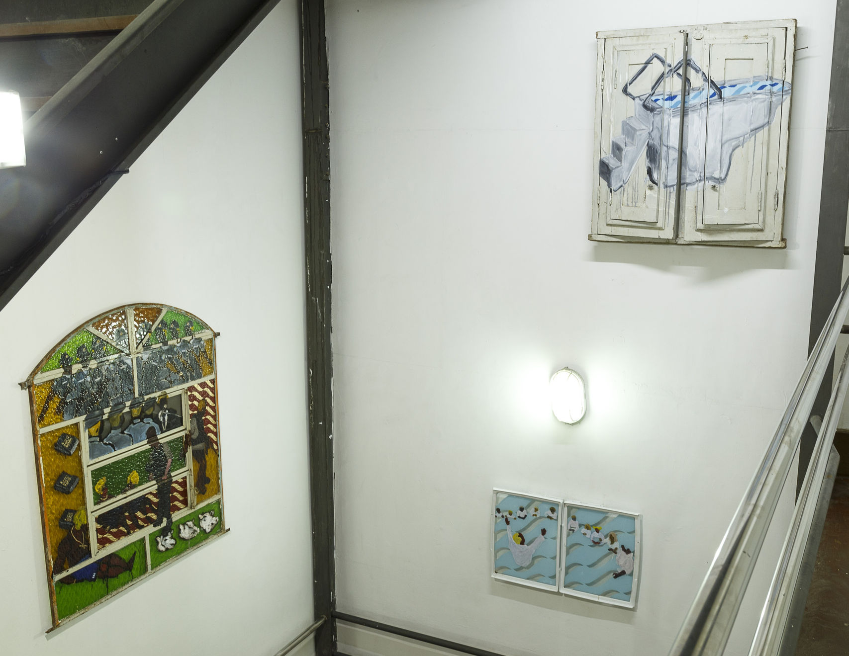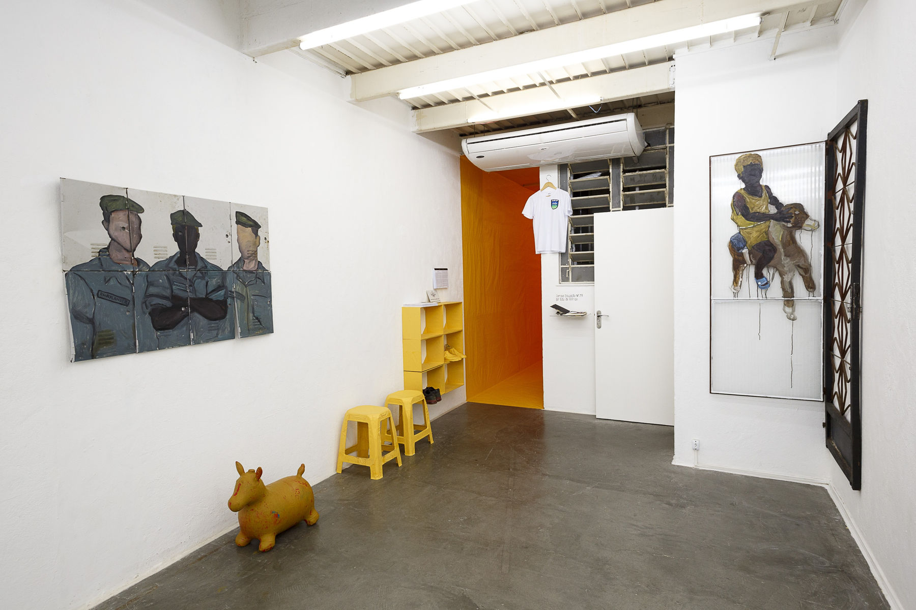 A lógica das pinturas sobre portas e esquadrias de ferro reais e comuns nas casas da favela é inversa daquela dos “murais” do cotidiano comunitário, já que toda celebração coletiva tem na intimidade doméstica seu contraponto reflexivo. De acordo com citações que separam as seções do Catálogo 2017 – convite para colaborar: não foi pedindo licença que chegamos aqui e Laje só existe com gente.