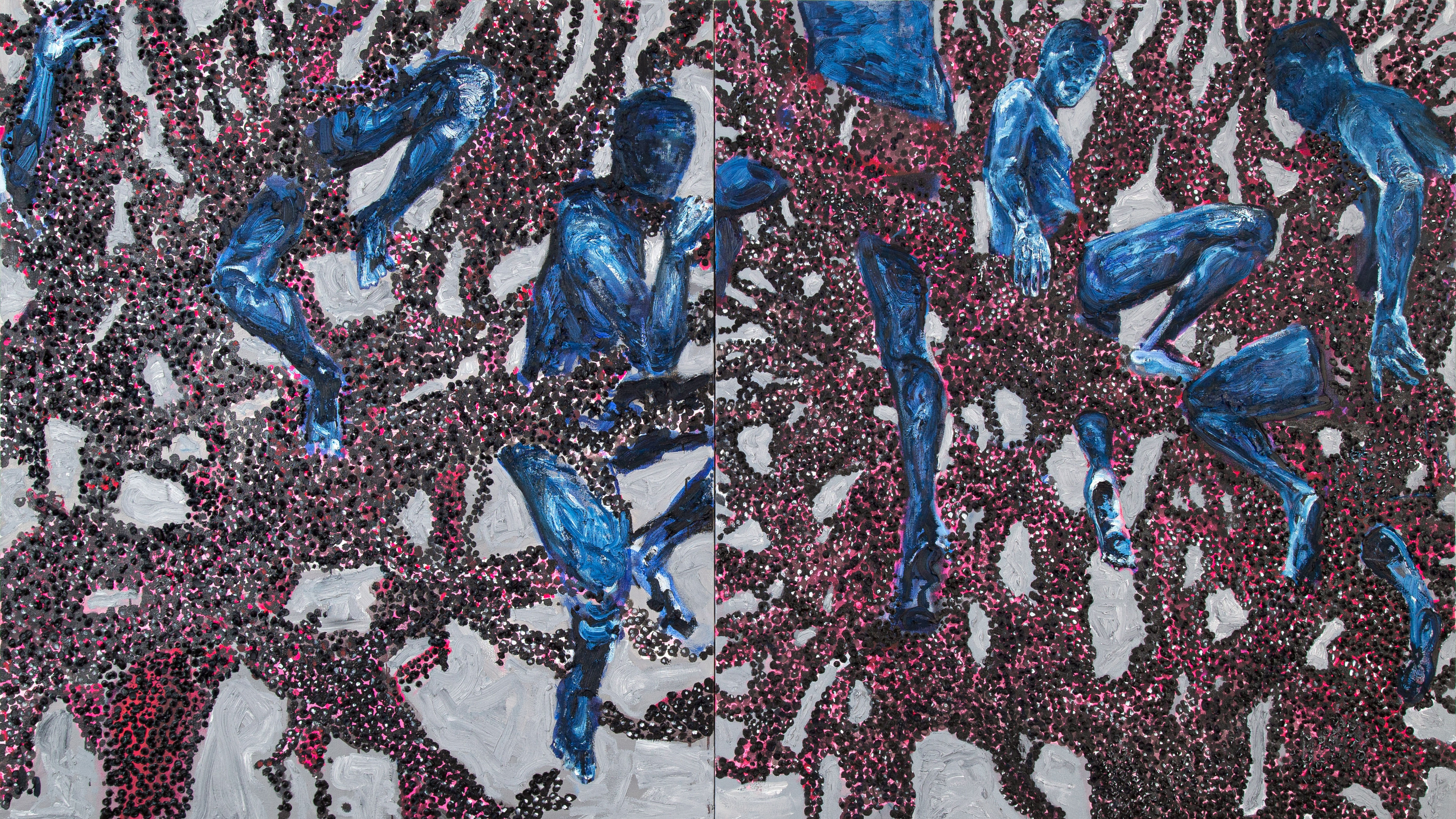 Os fenômenos dos tempos entre as grandes lacunas de viver e morrer são ações dos nossos sentidos, das sensações que encarnam os ciclos, das emoções que conduzem as percepções e as vivências que figuram as nossas existências. Em Primeiras Estórias, série de pinturas de Vinicius Gerheim, são ressaltadas as relações espontâneas entre sensações de naturezas diversas interligadas por ações de memória, intuição e imaginação do artista. A infância nas montanhas das Minas Gerais, abafada pela atmosfera de extrativismos e perdão, é elaborada no esforço de refutar os projetos de fragmentação da vida executados pelo cistema heteronormativo das institucionalidades. Olhos que alimentam e vigiam, alguns sangram para começar a brincar, outros já protegem mordendo. Formas, ritmos, vibrações e simpatias compõem relações de forças que criptografam sua própria existência. São pinturas que desordenam as fronteiras do público e do privado ao agenciar os limites da linguagem e do próprio ser. Eu sinto, ao presenciar as telas caminhadas por gestos de tinta de Vinicius, um chamado ao embricamento profundo com os ciclos da vida, simbióticos, afetados pelas interligações constantes que somos capazes de sentir ao estarmos dispostos. Intensifica-se o fim, amplia-se os limites, cava-se mais um pouco, quando se tem consciência da finalidade dos seres e das coisas, se vive os intervalos com maior paixão.
