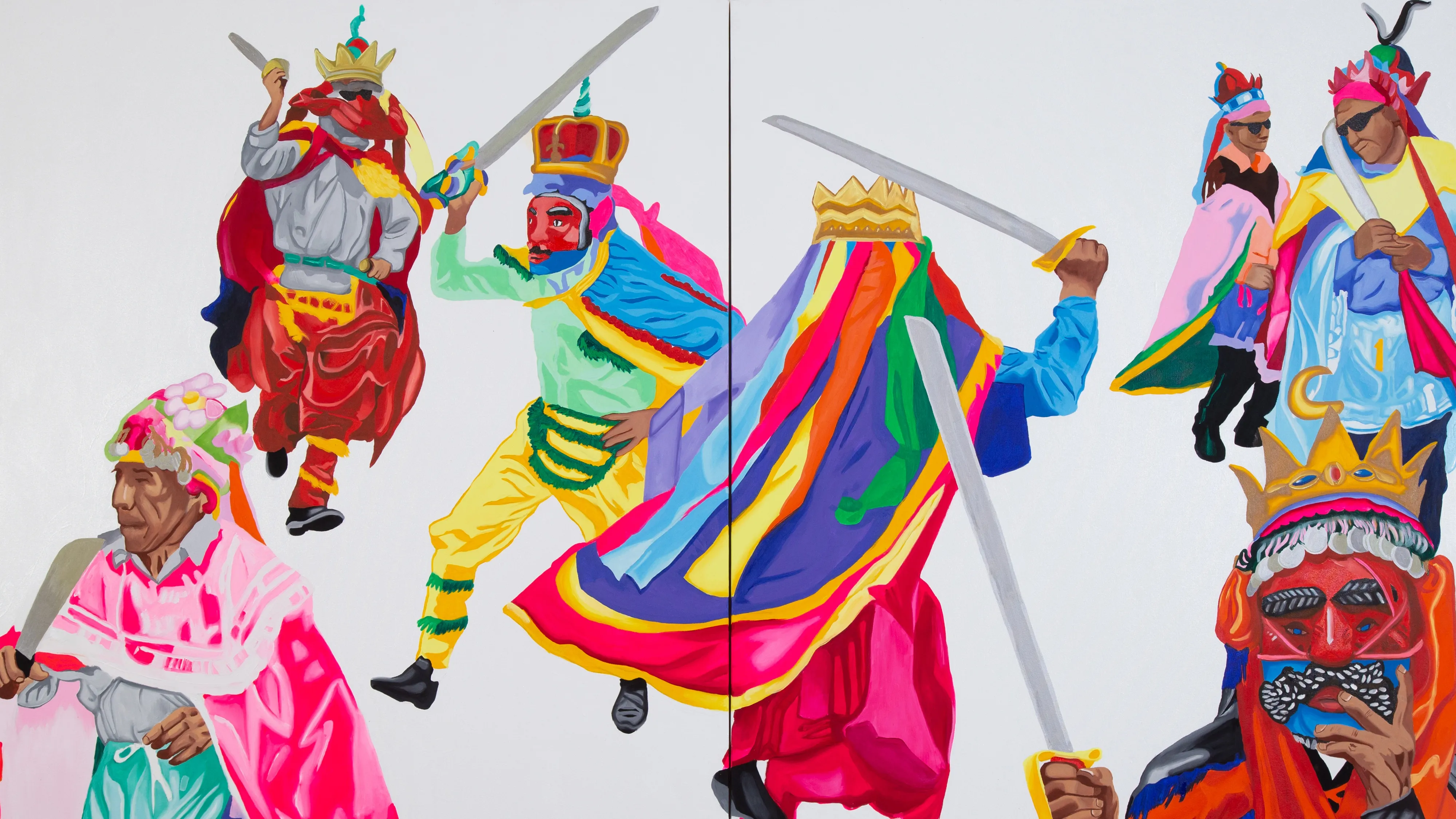 Leda Maria Martins, nesse sentido, propõe o entendimento do corpo como um portal de sabedoria, onde a partir da performance corpórea se atravessa o tempo², logo pensar a história para além da colonialidade exige atenção aos veículos transtemporais de manutenção de vida. Nestas obras, vemos transbordamentos entre evangelização e dança, trabalhados a partir de episódios onde as Américas, e os corpos que habitavam estas terras, se afirmam enquanto movimento pulsante de um baile em meio à guerra. Se a colonização empreendida pelo Estado e pelo Clero elaborou complexas estratégias de dominação, a ibirapema ³, metamorfoseada como pincel, interrompe a continuidade da catequização de nossos imaginários. Nesse sentido, Herbert De Paz entende a linguagem pictórica como um dos eixos possíveis de prefiguração do mundo, afirmando propostas estéticas em oposição às imagens orientadas por métodos interpretativos e fundados a partir de espectros traumáticos e violentos.