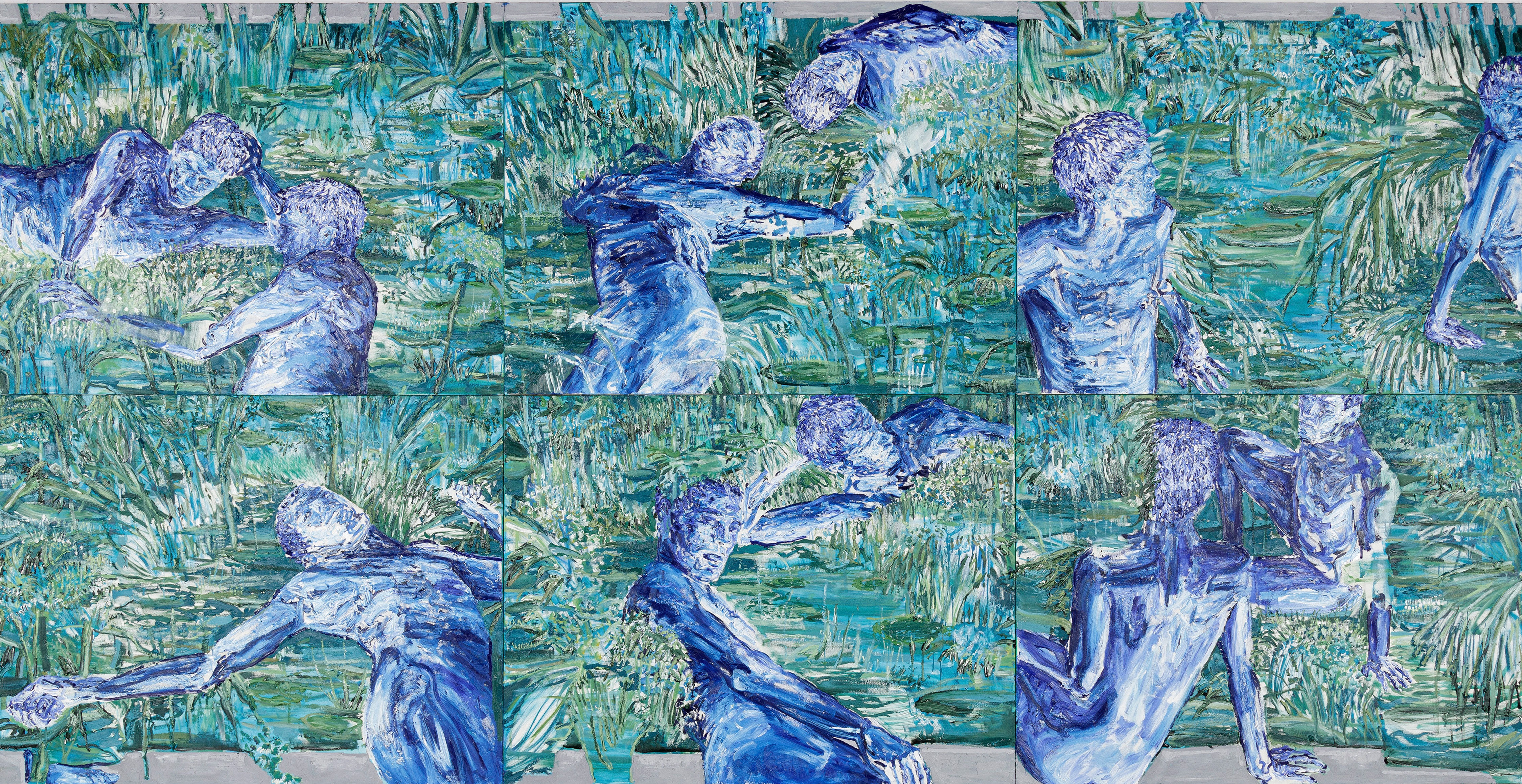 Nas telas que antecedem esta série, não existia fundo ou existia só o fundo. As telas consistiam ora de figuras flutuando no vácuo, ora de padrões inspirados em tecidos e estamparia, não contando com figuras humanas. Na última exposição n’A Gentil Carioca, a figura humana aparece em transição, querendo transformar-se em vegetação ou em animal, em alguns casos em galinhas, peixes, cachorros selvagens, maritacas ou amamentando-se de uma vaca, em outros casos virando homem-banana, homem-jabuticaba, ou homem-manga. Nas telas de BREJO, você agora se transforma quase em paisagem - em mar, deserto, pantanal - na fronteira entre fundo e figura, entre o retratado e a paisagem que se dissolve. Também aparece um excesso de pintura, sobretudo de óleo, mas também de acrílica, assim como diferentes técnicas de pintar que parecem fazer referência à diferentes momentos da história da pintura. Você poderia falar mais desta série de pinturas, de como se deu a transição em direção a elas, e em que direção você acha que elas continuaram?