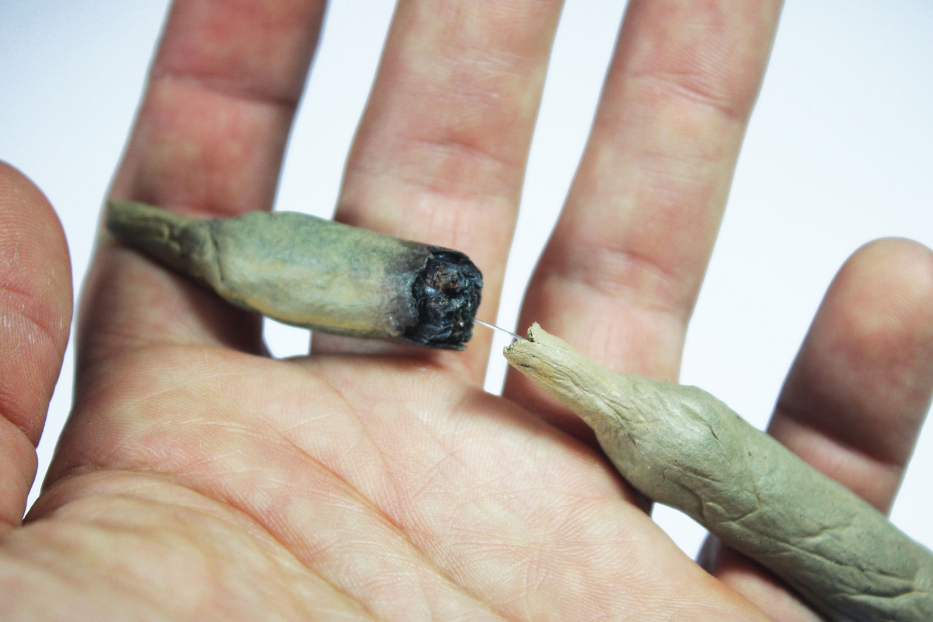 A manufatura dessas peças é muito semelhante à do cigarro real, porque a argila é de fato enrolada em papel seda para adquirir sua textura, além disso, a queima também se faz presente quando a argila vai ao forno e fica incandescente, ou seja, a proposta do ritual também se reflete no fazer da obra.